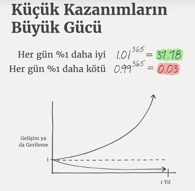 Edinmek istediğimiz alışkanlık için çok küçük adımlar atarak ilerleyebilirsin. Gün içinde yaparken bir şey ifade etmeyebilir fakat ayın sonunda, yılın sonunda bunların toplamının ne kadar etkili olduğunu göreceksin.
