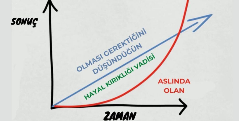 Küçük adımlarla ilerlerken bir yandanda yaptığımızın karşılığını hemen görmek isteriz. Yani yukarıdaki grafikteki gibi lineer bir beklentimiz vardır. Zamanla etkini artmasını isteriz. Fakat gerçekte süreç böyle işlememektedir. İşte bu yüzden alışkanlık edinmek çok zor bir şeydir. Attığımız atomik adımların etkisi bambu ağacının büyüme eğrisi gibidir. Uzun bir süre acaba boşa mı çabalıyorum diyebiliriz. Herhangi bir sonuç elde edemeyebiliriz. Ama bu aşamada sabredip, istikrarlı bir şekilde atomik adımlara devam edersek bambunun ulaştığı zafere ulaşabiliriz. Hem de beklentimizin çok üstünde bir sonuca ulaşmamız oldukça mümkündür.